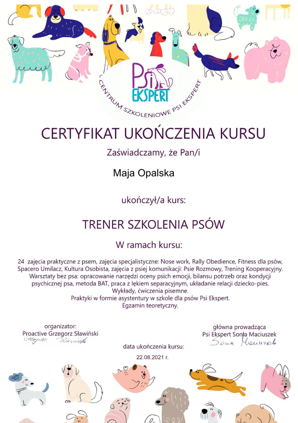 Hej! Jeśli jesteś na tej stronie, to znaczy, że zależy Ci na relacji ze swoim psem i chcesz go zrozumieć, lepiej poznać, być może pomóc mu w jego trudnościach, wesprzeć w lękach albo okiełznaniu rozhulanych emocji. Chętnie podzielę się swoją wiedzą zdobytą na licznych kursach
