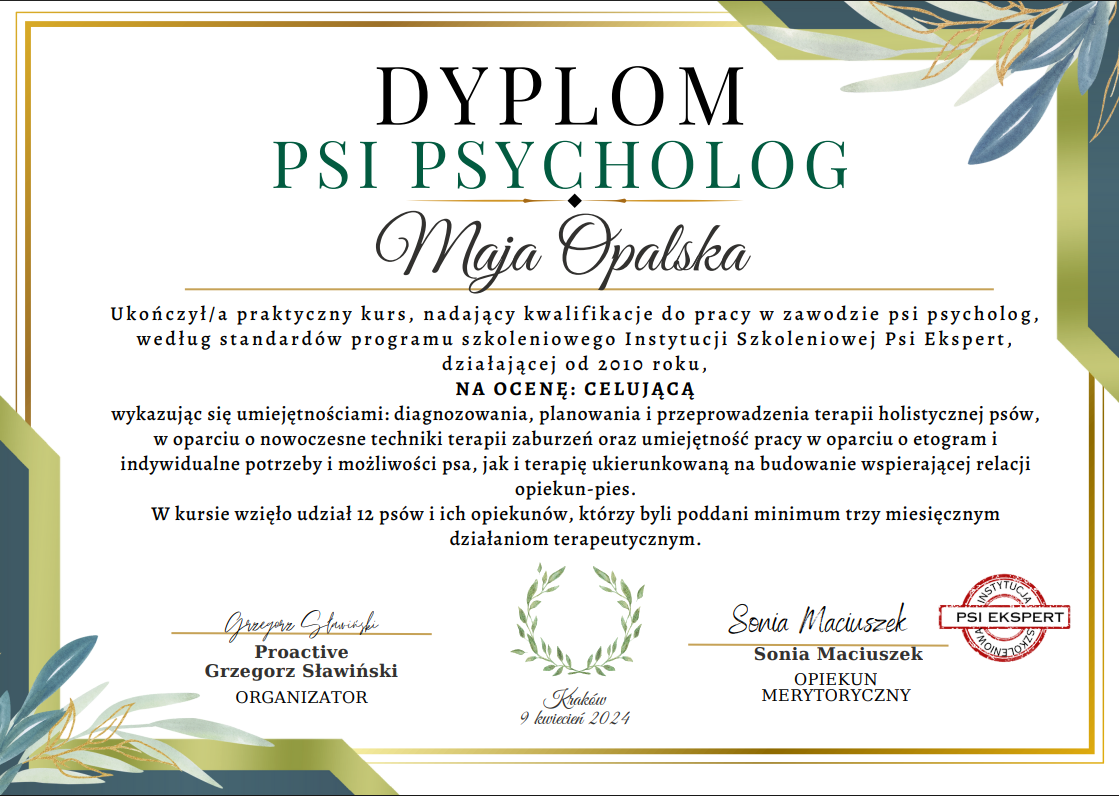 Hej! Jeśli jesteś na tej stronie, to znaczy, że zależy Ci na relacji ze swoim psem i chcesz go zrozumieć, lepiej poznać, być może pomóc mu w jego trudnościach, wesprzeć w lękach albo okiełznaniu rozhulanych emocji. Chętnie podzielę się swoją wiedzą zdobytą na licznych kursach